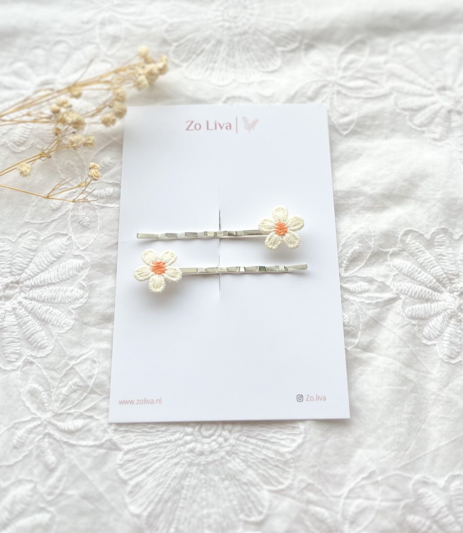 Kijk hoe leuk? Een setje van twee schuifspeldjes met madeliefjes erop bevestigd.