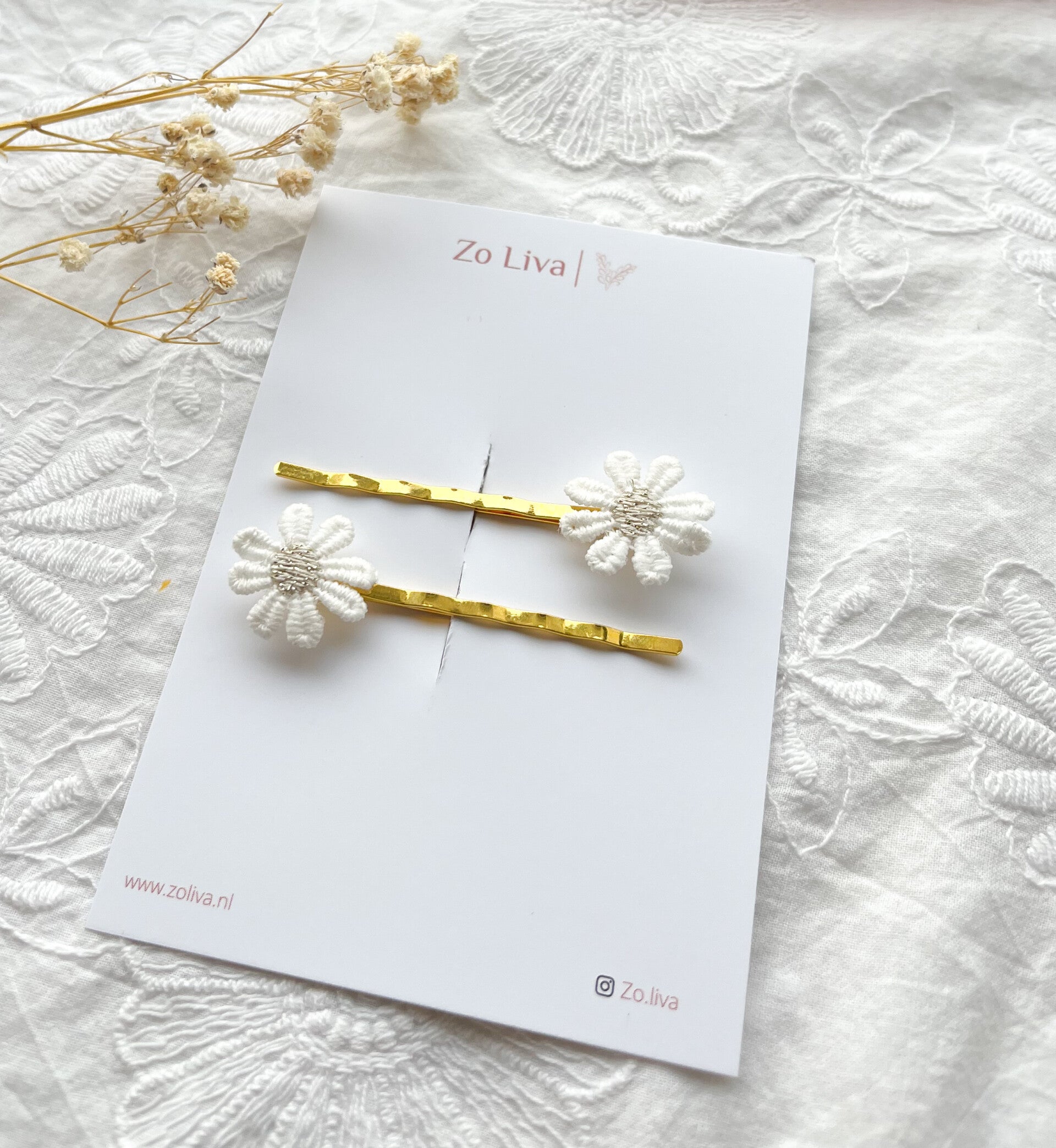 Kijk hoe leuk? Een setje van twee schuifspeldjes met madeliefjes erop bevestigd.