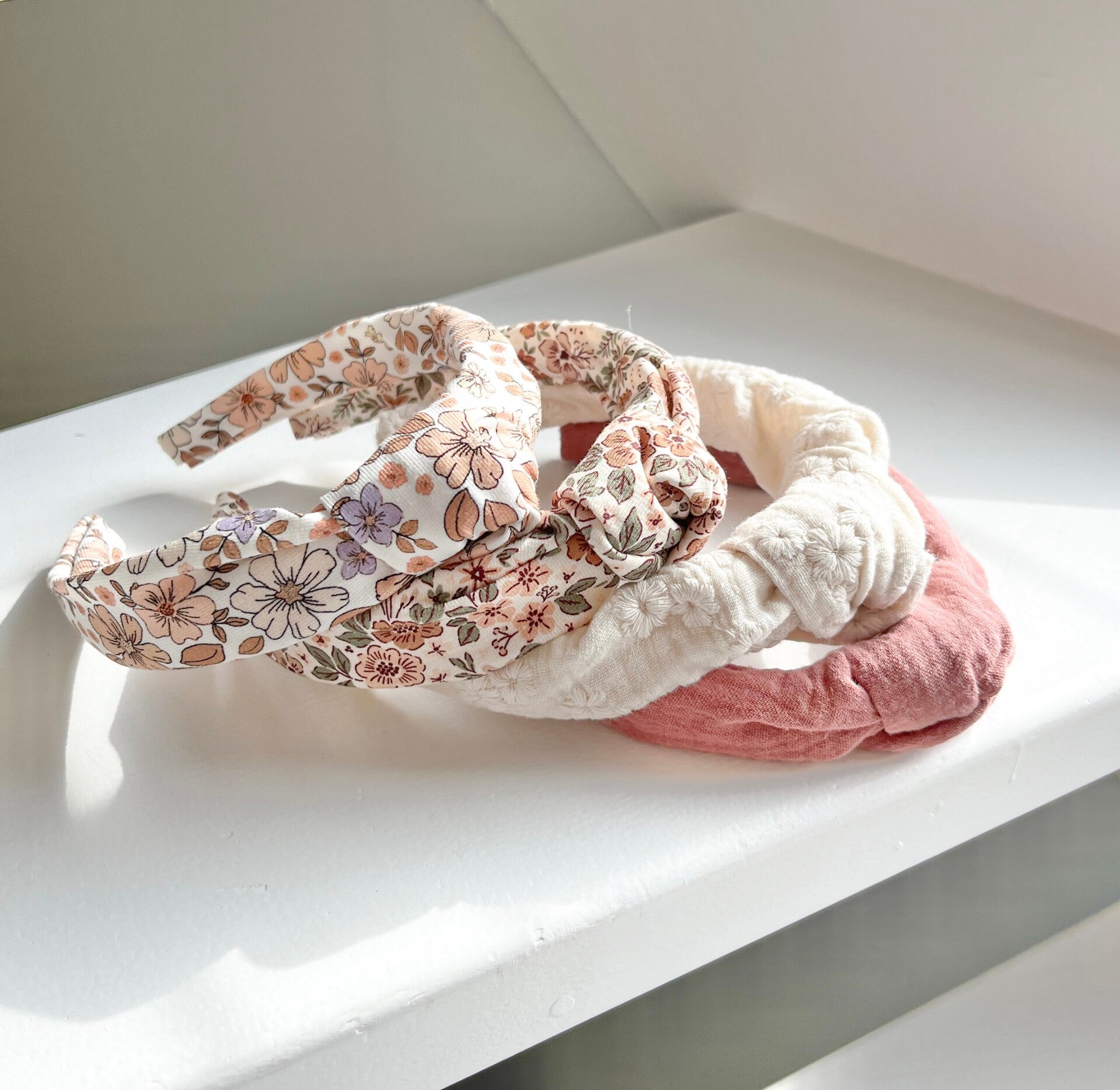 Helemaal hip zijn deze prachtige, stoffen diademen met knoop. De diadeem heeft een mooie broderieprint, is heel zacht en al te dragen vanaf ongeveer 3 jaar.