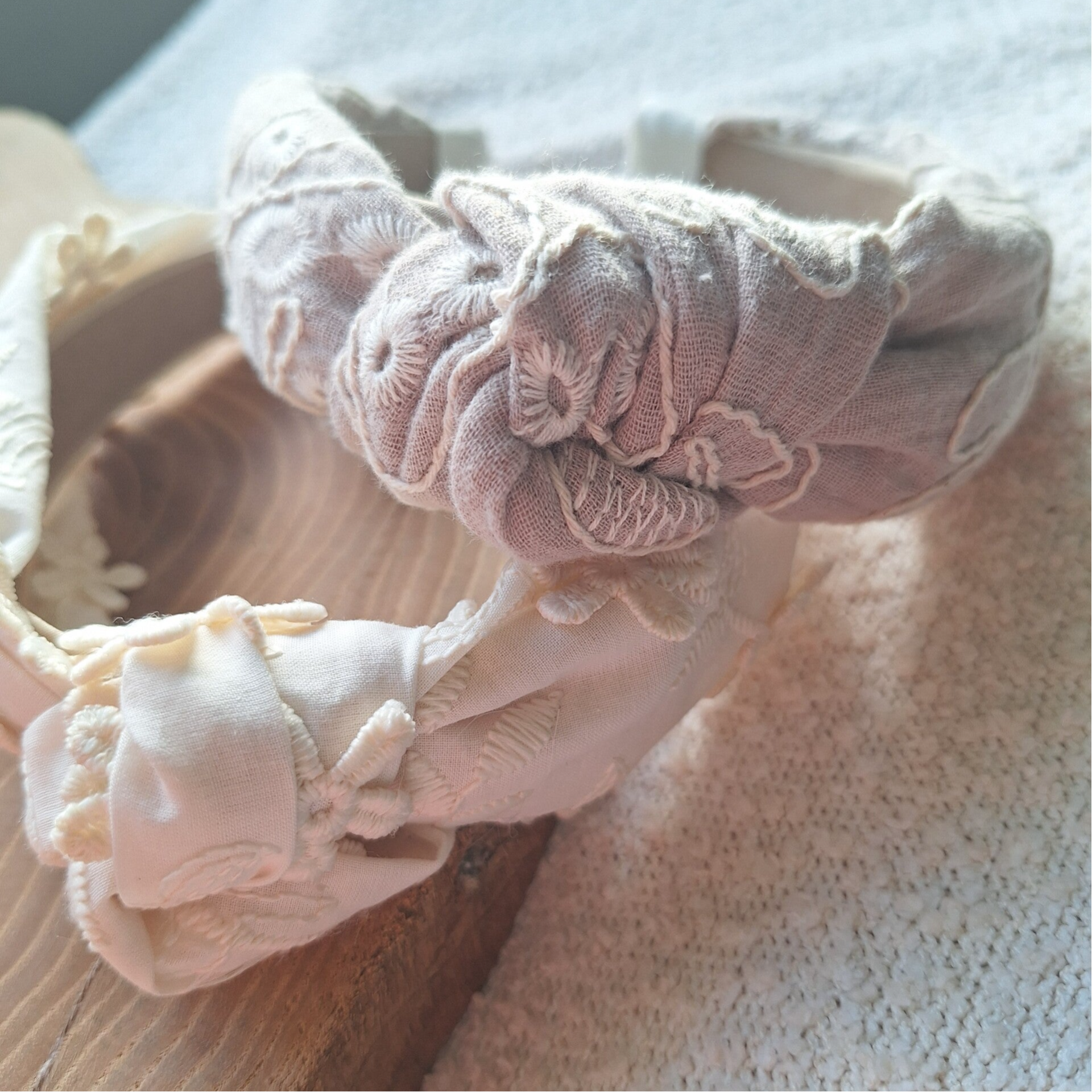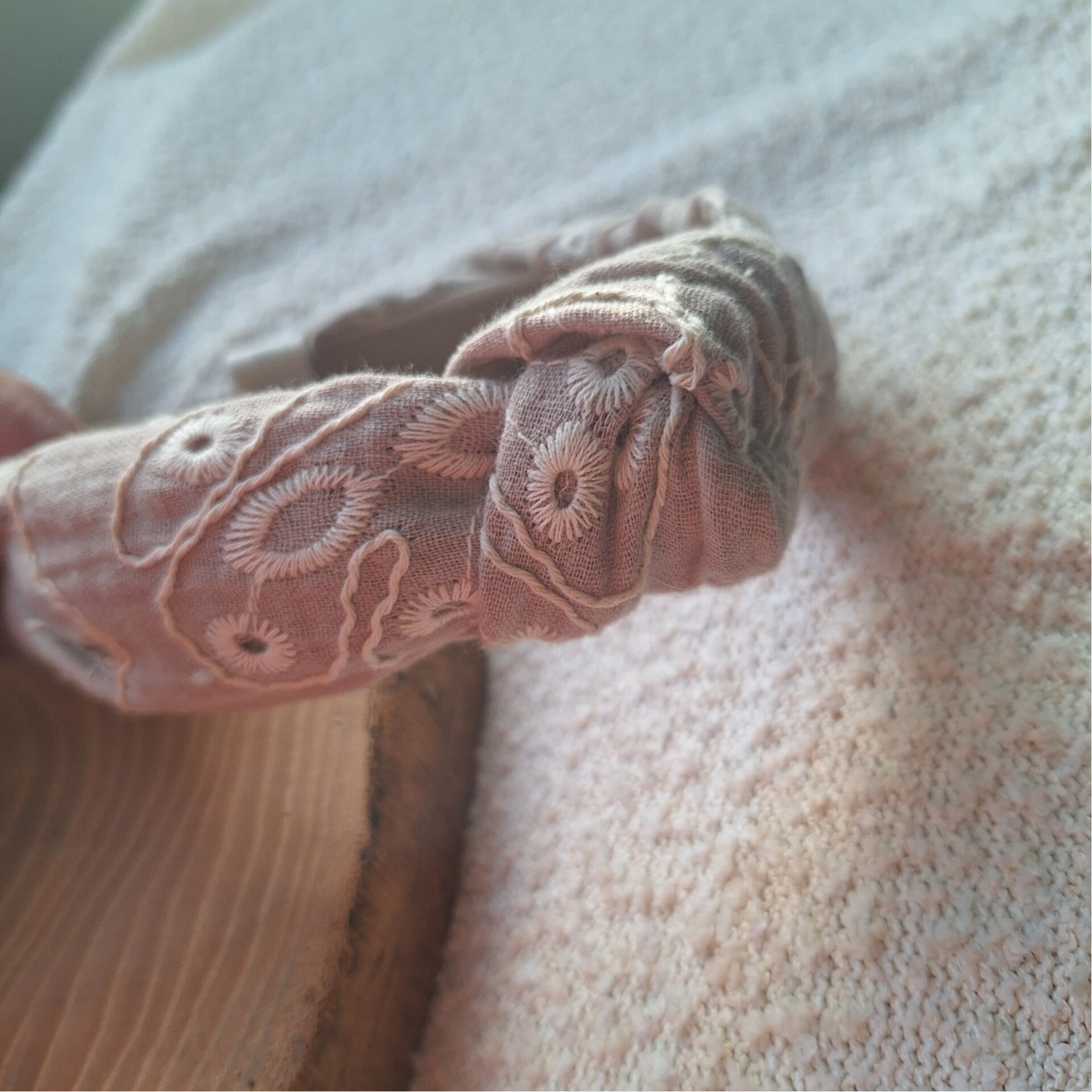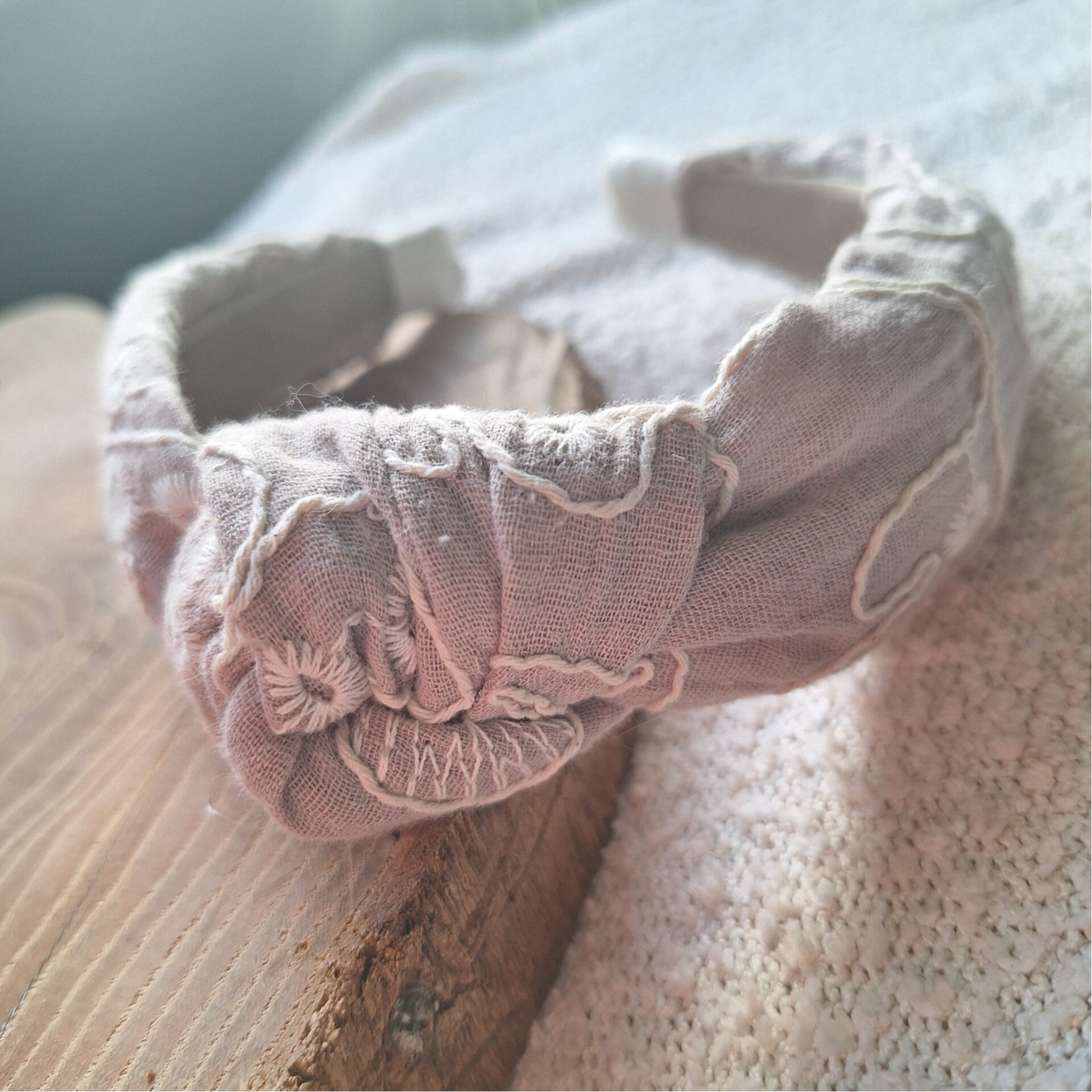 Helemaal hip zijn deze prachtige, stoffen diademen met knoop. De diadeem heeft een mooi geborduurde print, is heel zacht en al te dragen vanaf ongeveer 3 jaar.