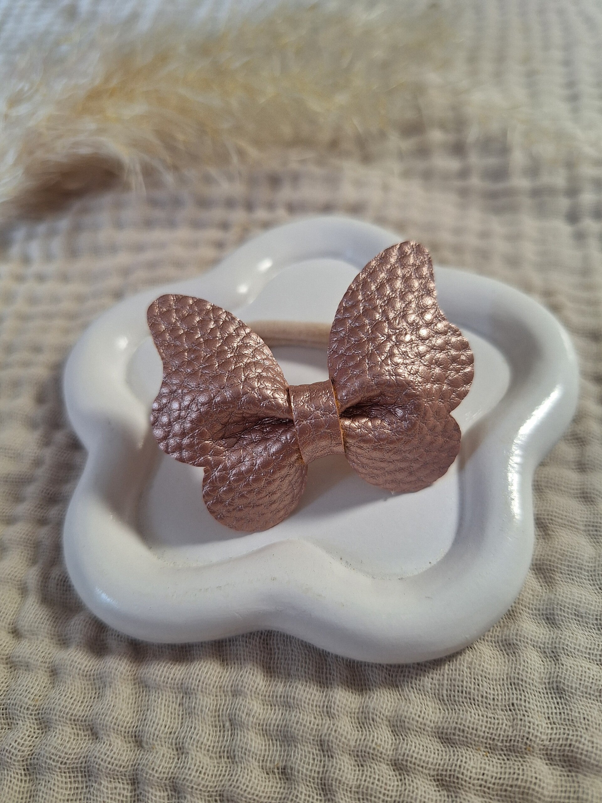 Deze vlinders zijn gemaakt van kunstleer en zitten bevestigd op een middelmaat elastiek. Wij hebben deze vlinders in diverse kleuren, prints en zelfs met glitters.
