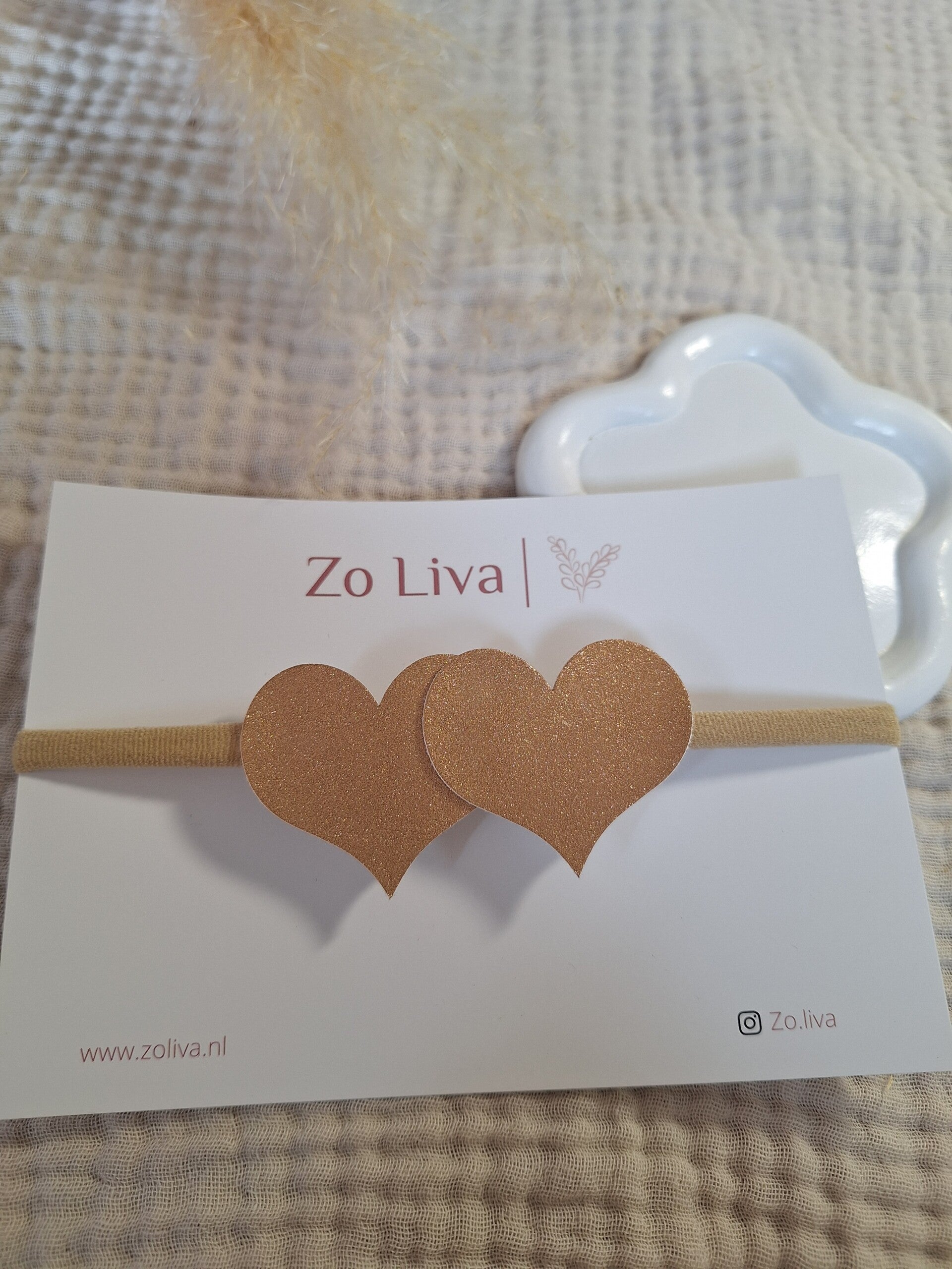 Een beige, huidskleurig haarbandje met hartjes erop bevestigd.