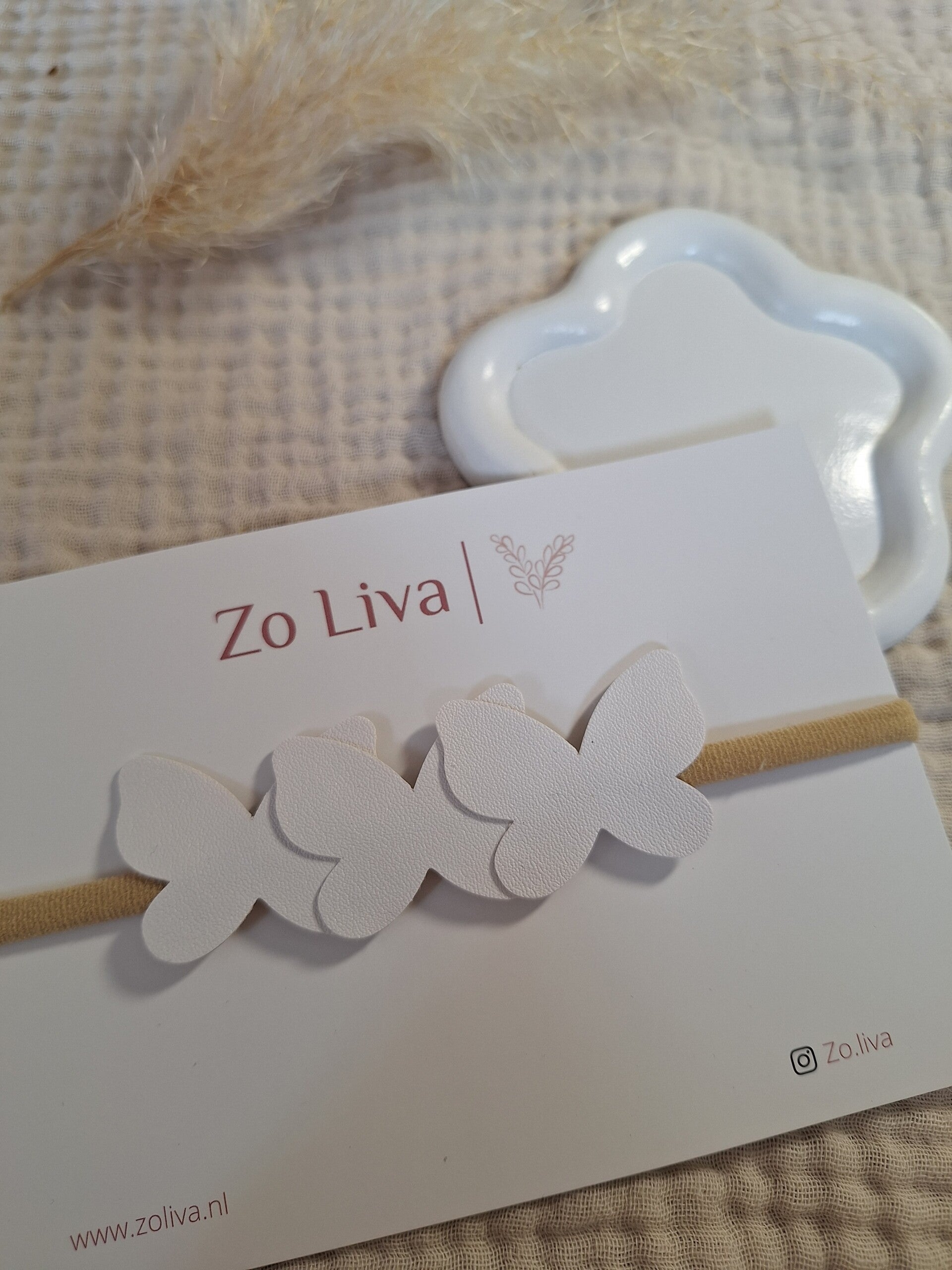 Een beige, huidskleurig haarbandje met vlinders erop bevestigd.