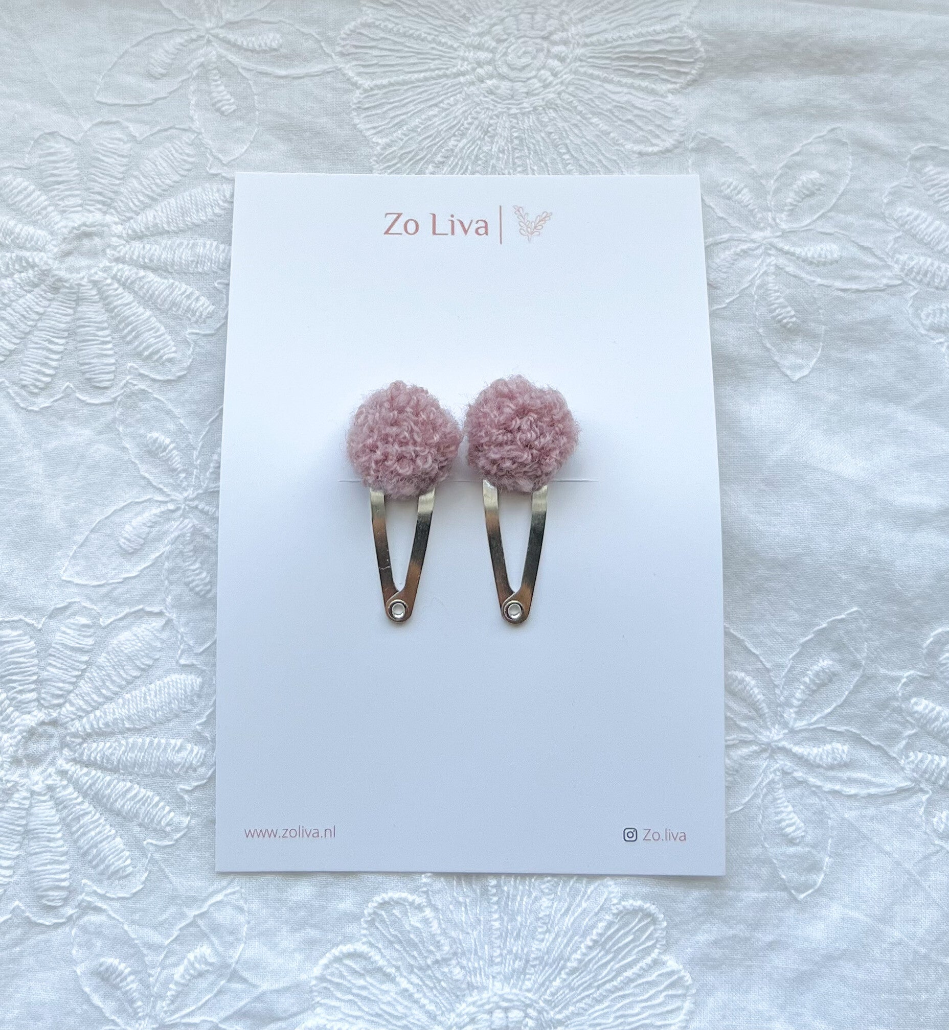 Haarspeldje Pompon oud roze. Een klik-klak speldje met zachte, wollige pomponnetjes erop. Te bestellen in drie verschillende formaten, waardoor ze ideaal zijn voor zowel kleine als grote meiden.
