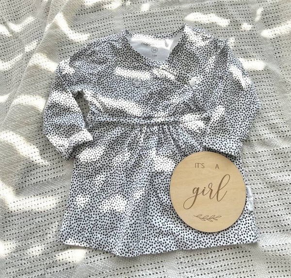 Leuk om deze houten kaart op de foto te zetten om aan familie en vrienden te vertellen dat er een meisje op komst is.