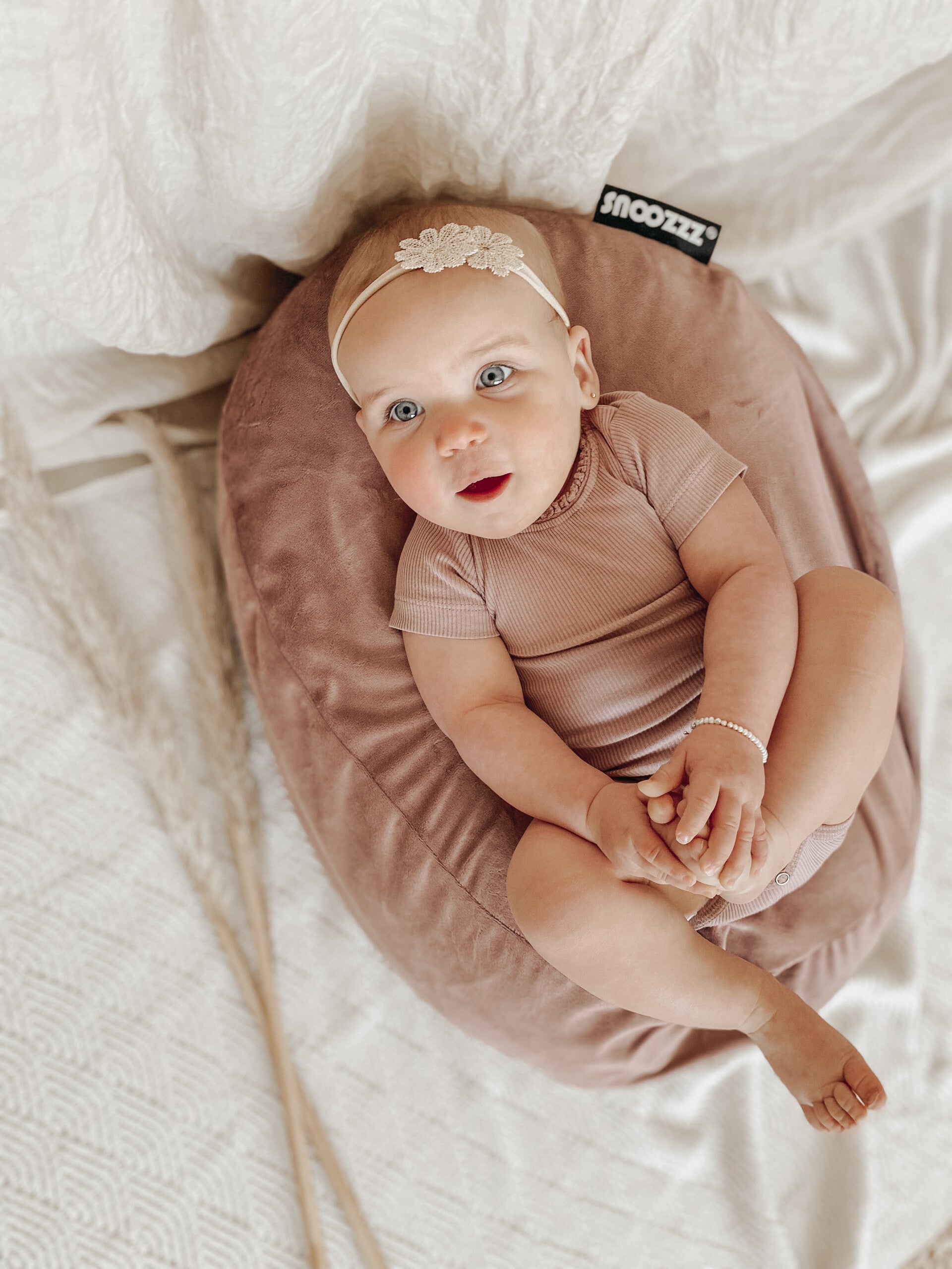 Een beige, huidskleurig haarbandje met rosé kleurige bloemen erop bevestigd. Doordat er enorm veel strech in het haarbandje zit, knelt deze niet en laat daardoor ook geen afdrukken achter. Én mede door de stretch zijn deze haarbandjes heel lang door te dragen en daardoor ook leuk voor wat grotere meiden.
