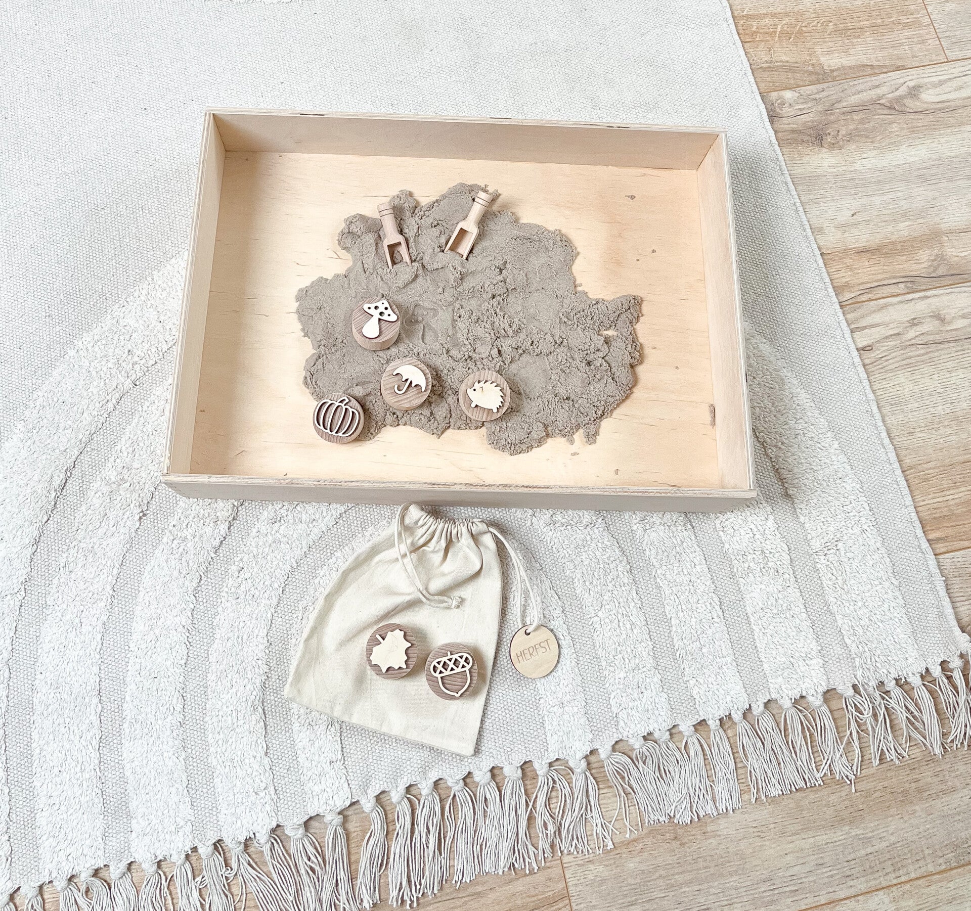 Een mooie, houten stempelset met herfst thema. Een paddenstoel, paraplu, pompoen, egel, blad en een eikeltje. Hiermee kun je de perfecte herfst wereld maken.